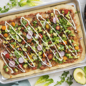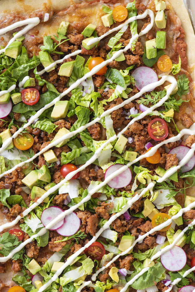 Don’t have any plant based meat on hand and really need your ground beef or turkey fix? Don’t worry, you can use that too! Want to make it vegan? You can sub plant based cheese and sour cream too. The point is take the base of this Taco Salad Pizza and make it your own. I promise you will be pleased!