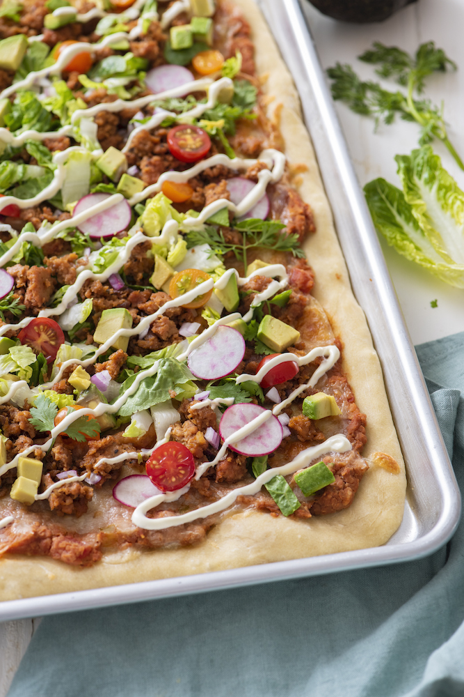 I’m always trying to vary the vegetarian meals we eat throughout the week and especially on Monday. Sometimes it’s bean based (these Pressure Cooker Pinto Beans are a favorite) and other times it an easy tofu recipe. These days we’ve been making weekly recipes with plant based ground meat proteins. This Taco Salad Pizza is so simple, packed with flavor and a great way to use what’s fresh at the farmers market and in our garden.