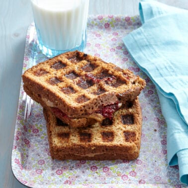 The night I gave birth to Chloe all I wanted afterwards was a peanut butter and jelly sandwich. Call me a girl with simple taste, but it’s true — I only craved thick, sliced sandwich bread, toasted and slathered with tons of smooth peanut butter and fresh strawberry preserves. I forgot one thing. It had to be made in a waffle iron!