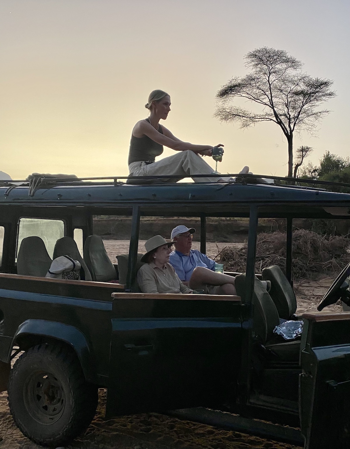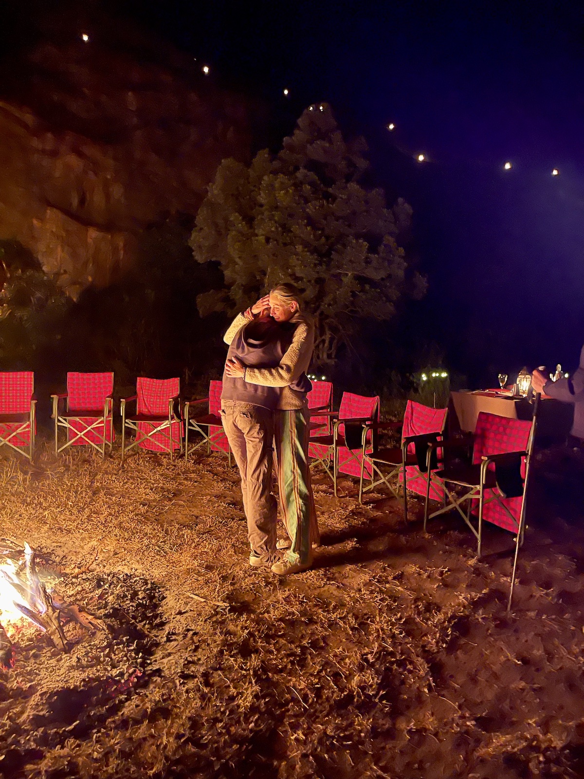 At 5pm, we would depart for an evening game drive and then watch the sun set in incredible mountain-top locations while having a “sundowner” (as the locals call them), a drink made to order and snacking on appetizers. Then, after a lovely dinner, we retired to our tents where we slept warmed by roaring fires and the hot water bottles in our beds. On our last night at Enasoit, we were surprised with a dinner under the stars at the foot of a mountain 20 minutes from our camp, the air filled with cries of hyenas. It was a night we will never forget.
