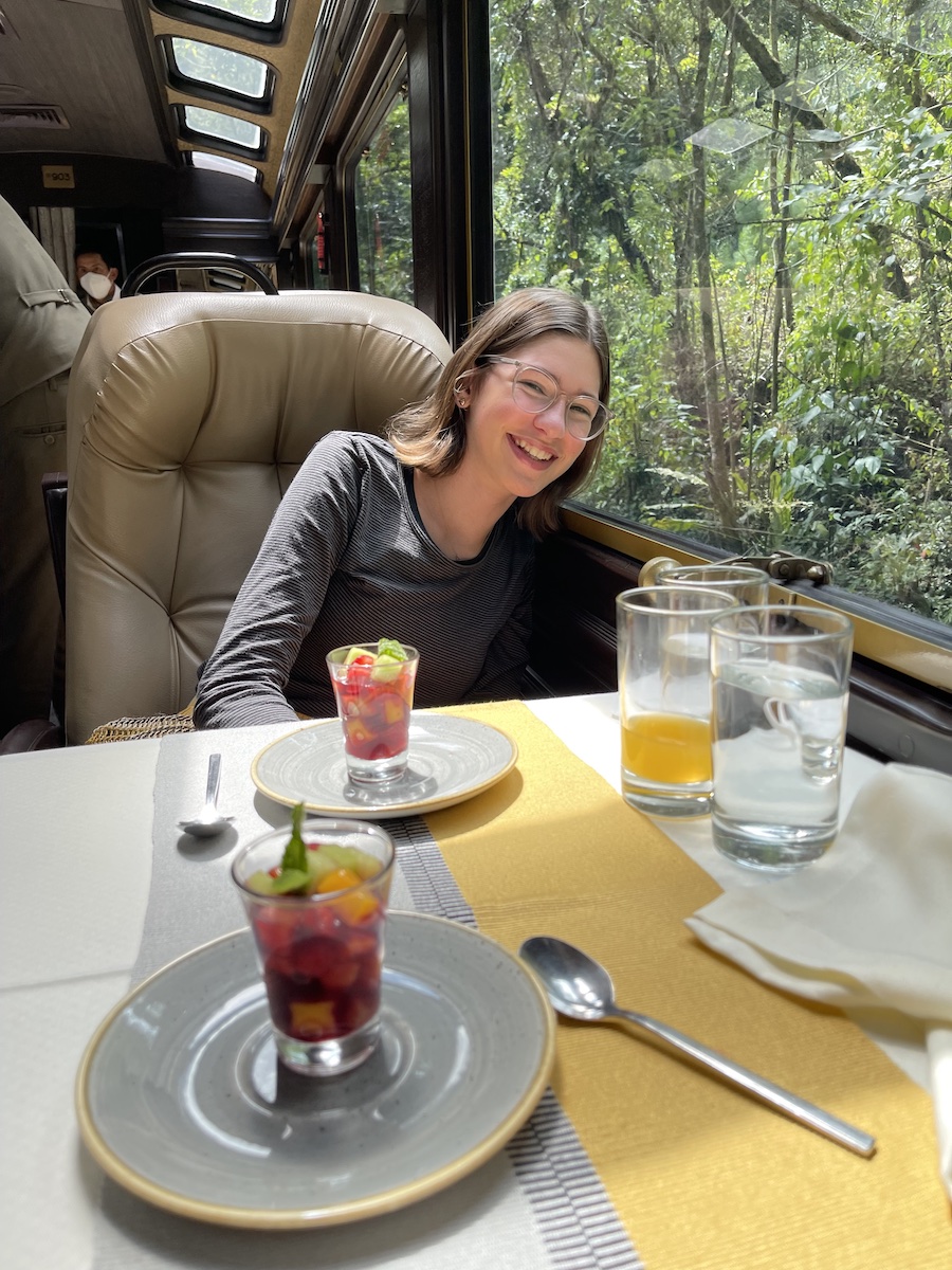 There are two ways to get to Machu Picchu: hiking or by the Incan Trail Rail. Someday I want to hike the Inka Trail to get there, but for our first go round we decided to take the train, which happened to be one of the highlights of our trip. On the way there, we rode in the premiere car which served a delicious lunch (quinoa salad with asparagus, tomatoes and guacamole plus chicken in elderberry sauce with potato galette and fruit salad) and Pisco sour.