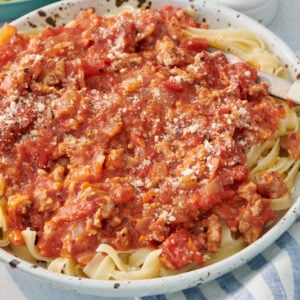 Make-Ahead: Turkey Bolognese is a great recipe for making ahead because it stores really well and it get better while flavors meld as it sits. To make ahead, simply prepare according to steps 1-7 of the recipe directions, below. Once cooled, transfer to an airtight container and store in the refrigerator for up to 5 days. When ready to enjoy, reheat bolognese sauce on the stovetop. Once simmering, finish according to 8-9 of recipe directions below.