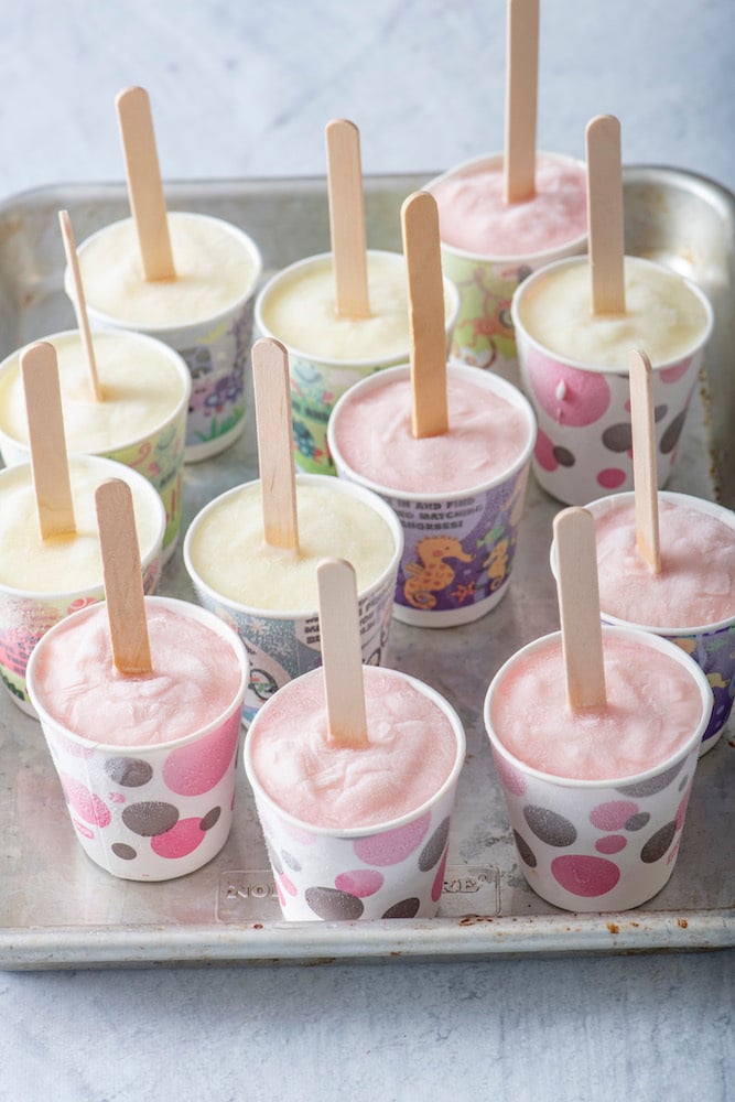 - Pour into Dixie cups, place wooden popsicle sticks in the middle and freeze 4-6 hours or until frozen through.