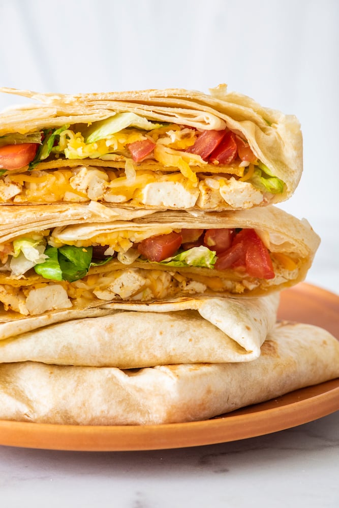 - Place the large tortilla on a work surface. Top with tofu, 1/2 the sauce, 1/2 the cheese and the crispy tortilla. On top of the crispy tortilla, add the lettuce, tomato, remaining cheese. The extra sauce is used for dipping at the end.