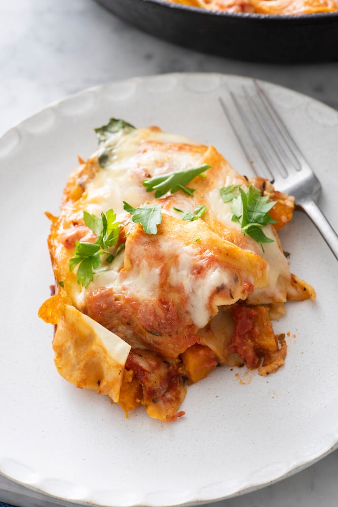This Vegetarian Skillet Lasagna is a quick weeknight meal that everyone will love. This easy lasagna is filled with butternut squash and spinach which gives it a healthy boost. Since the vegetables are layered with a delicious marinara sauce, the pasta and lots of cheese, no one complains! It’s one of my favorite recipes to make to get a serving of veggies in for everyone in the family.