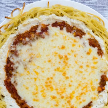 Vegetarian Spaghetti Pie is filled with tiny pieces of vegetables, a zippy red sauce, eggs, parmesan and ricotta cheese for protein and spaghetti as the carbohydrate making it a dish with everything you need all rolled into one!