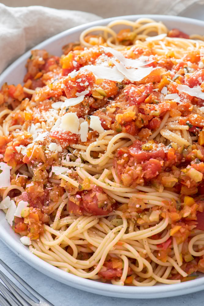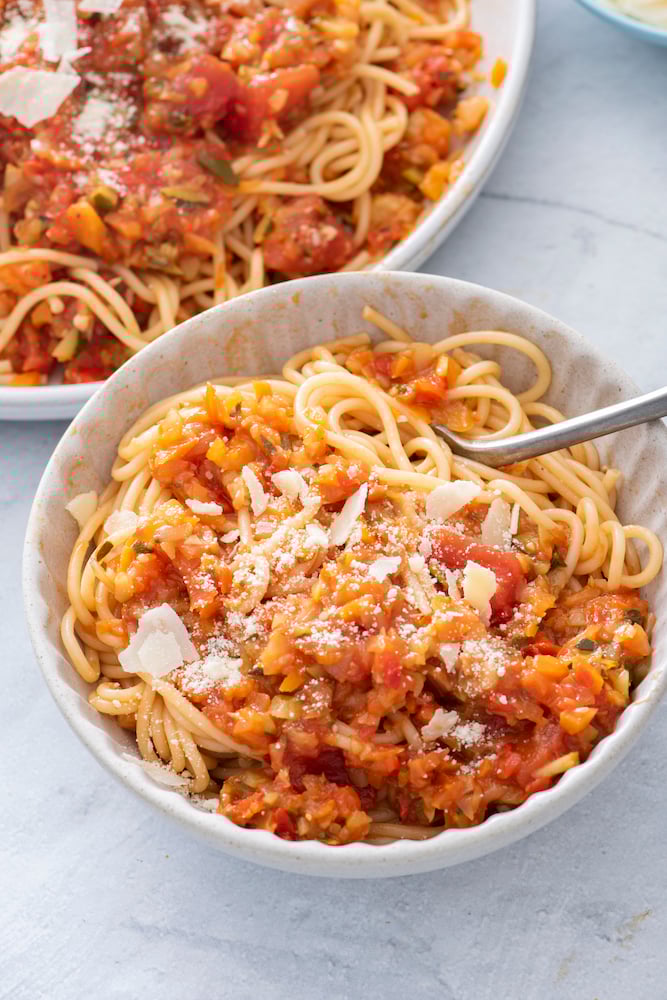 If you’re looking for more satisfying vegetarian pasta recipes, try out some of my favorites like Pasta Primavera, Wild Mushroom Pasta, Vegetarian Skillet Lasagna and Spaghetti Squash Marinara. In fact, you could top your spaghetti squash with this veggie bolognese sauce and have even more vegetables for dinner!
