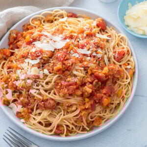 This Veggie Bolognese Sauce is a simple and quick recipe to get tons of vegetables in one delicious meal. It’s super versatile and can be used on top of pasta, rice or even grilled chicken!