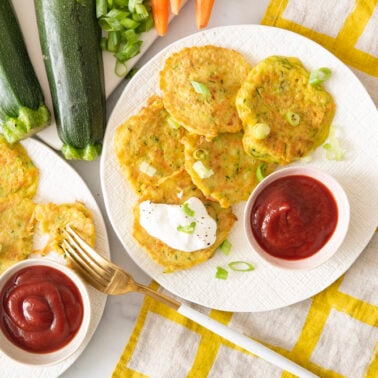 I’m always getting asked how to help kids eat their vegetables. This recipe is perfect for that! You can serve Veggie Pancakes for brunch, put them in a lunch box or even to have as a side dish at dinner. You’d be shocked at how quickly they get eaten. Serve them with a side of ketchup and dip away. Get ready to eat the entire batch in one sitting!