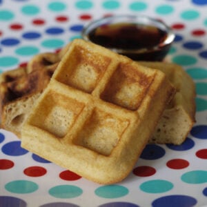 As a busy mom, I’m often tempted in the frozen food section as I pass the perfectly arranged boxes with pictures of golden-brown waffles piled high under amber syrup and perfect pats of butter, but when I think about the ingredients most boxed frozen waffles are made with AND the cost of them (6 waffles for $4!), it doesn’t seem worth it to me at all. Not when I can easily make my own healthy, delicious waffles at home for less money than the store brands (try 10 for under $2!) and not forego the convenience of frozen waffles.