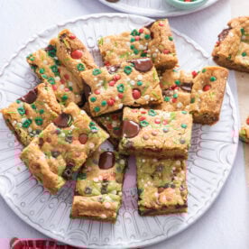 These Holiday Chocolate Chip Sprinkle Bars are soft, chocolatey and just downright delicious. I can guarantee, there will never be a crumb left anytime you make this recipe.