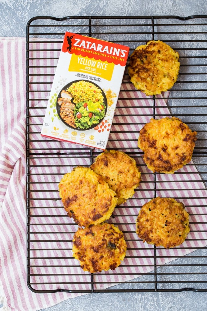As I do my best to never let food go to waste, whenever we have any leftover cooked yellow rice I love turning it into this simple vegetarian recipe. If you try these, I would love to hear about whether your family enjoys them. And, if you’re still looking for more inspiration when making yellow rice, try this quick to prepare seared shrimp, peas and yellow rice. A perfect one pot meal!
